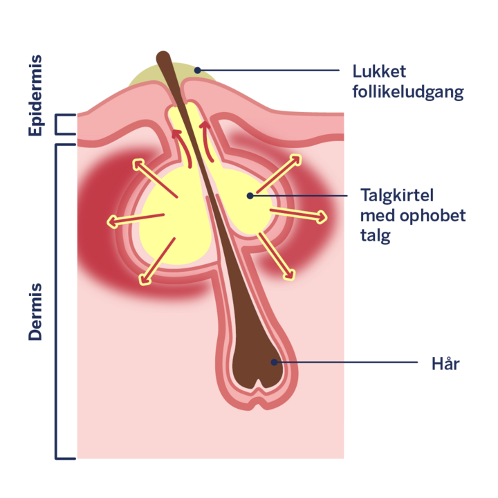 Ved akne handler det om en betændelsestilstand i talgkirtelfolliklerne. Follikler er de anatomiske strukturer, der fastholder hårene på vores hud. Ved talgkirtelfollikler er håret forholdsvis lille, mens talgkirtlen er stor i forhold hertil. Dette gør denne follikeltype udsat for urenheder.