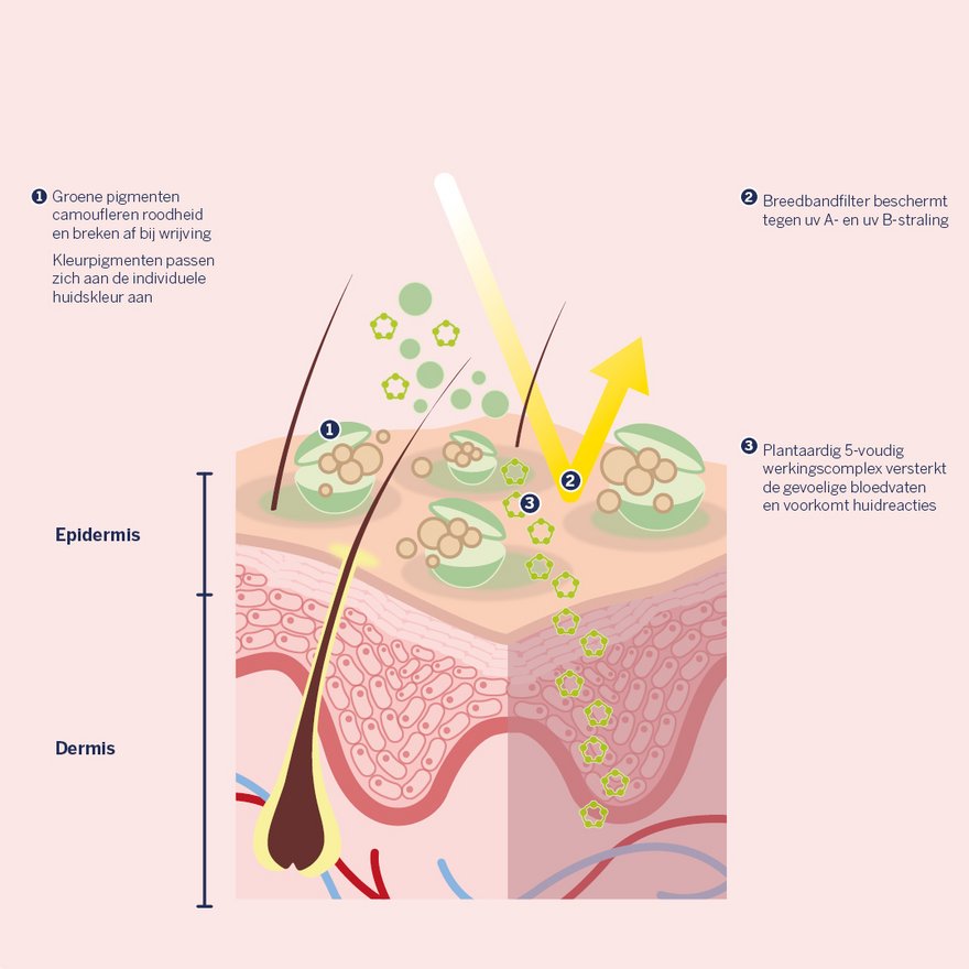 Gebruik als dagelijkse verzorging de DERMASENCE Tinted day cream with SPF 50. De getinte dagcrème biedt een hoge bescherming tegen zowel uv A- als uv B-stralen en kan zo zongerelateerde huidveranderingen voorkomen. De groene pigmenten neutraliseren huidroodheid en zorgen zo voor een egalere teint. Bovendien versterkt een 5-voudig werkingscomplex de bloedvaten en voorkomt roodheid.