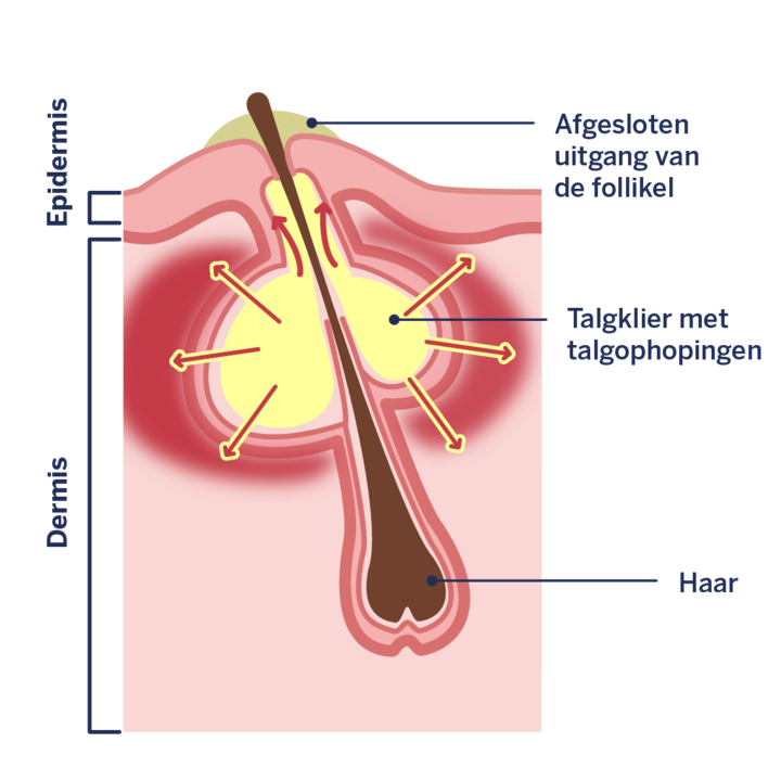- Hyperkeratose: de huid maakt teveel hoorncellen aan bij de poriën, waardoor deze geheel of gedeeltelijk sluiten en talg niet kan wegvloeien.